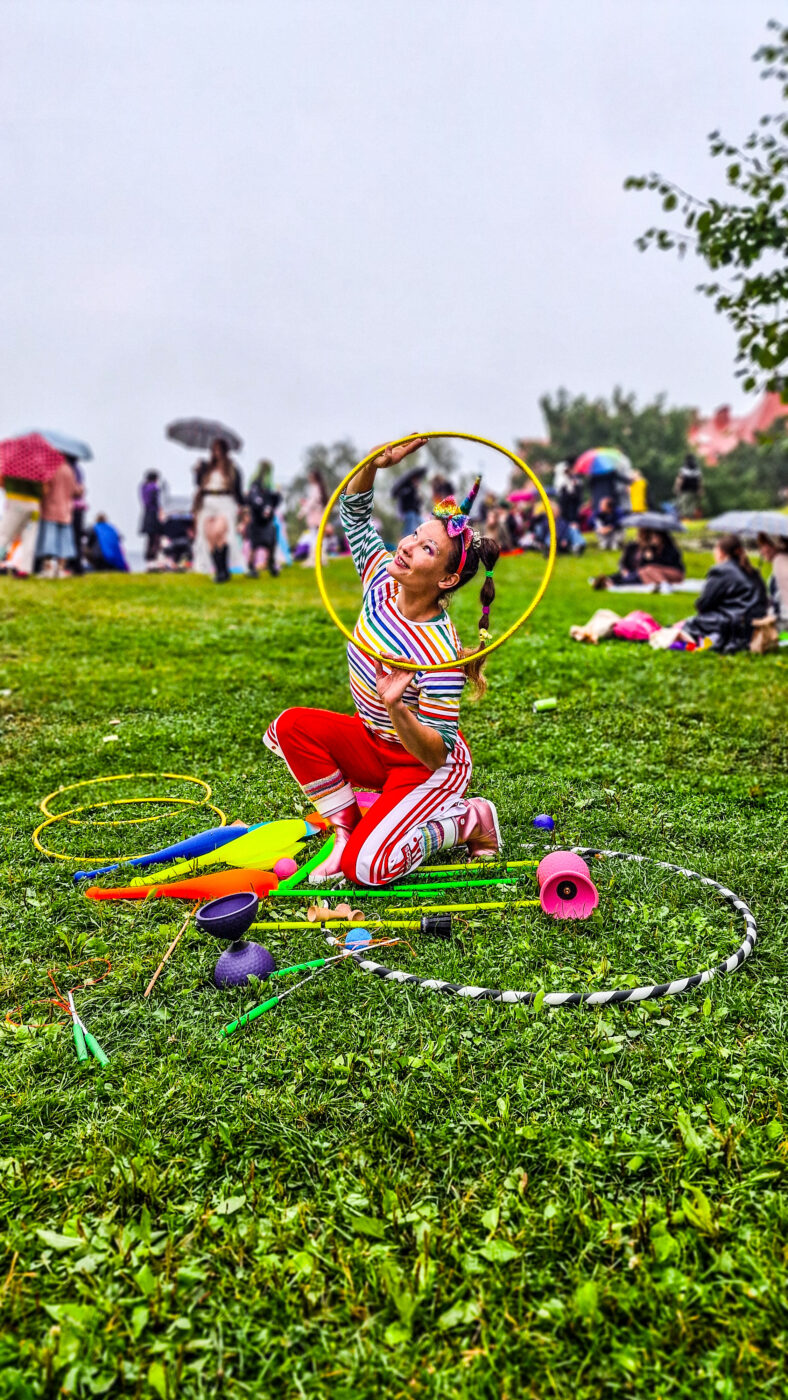Eri värisiä sirkusvälineitä makaamassa vihreällä nurmikolla. Vasemmalla oranssi ja keltainen jongleerauskeila, keskellä punainen, sininen ja oranssi lautanen. Ylhäällä violetti diabolo. Näiden ympärillä yksi mustavalkoraidallinen ja kolme kultaista hulavannetta.