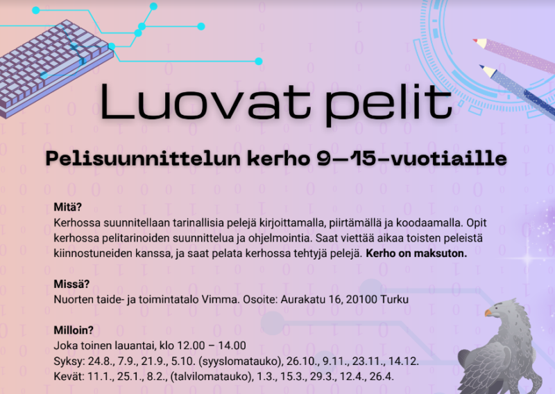 Kerhossa suunnitellaan tarinallisia pelejä kirjoittamalla, piirtämällä, pelaamalla ja koodaamalla. Luomme yhteisen peliuniversumin, avaruusseikkailun, jossa jokainen pieni peli on osa suurempaa tarinaa. Kerhon ytimessä on monitaiteinen sanataide ja tarinankerronta. Kerho on maksuton.