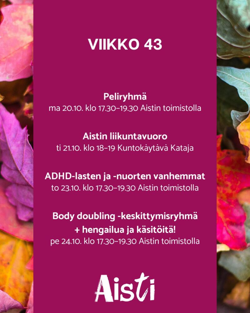 ADHD-lasten ja -nuorten vanhemmat to 23.10. klo 17.30–19.30 Aistin toimistolla
