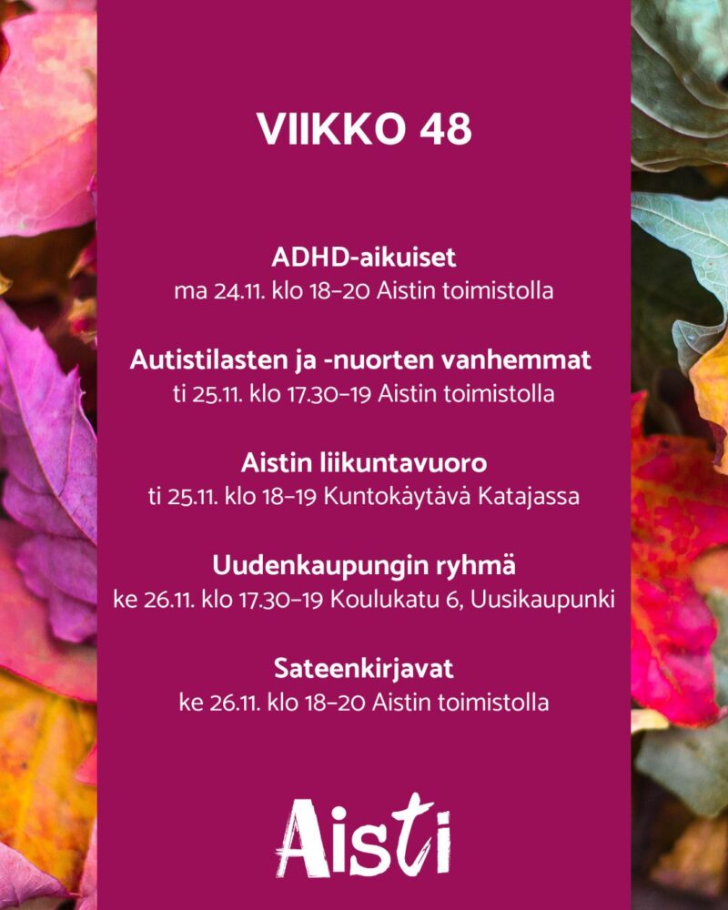 Autismikirjon lasten ja nuorten vanhemmat ti 25.11. klo 17.30–19 Aistin toimistolla