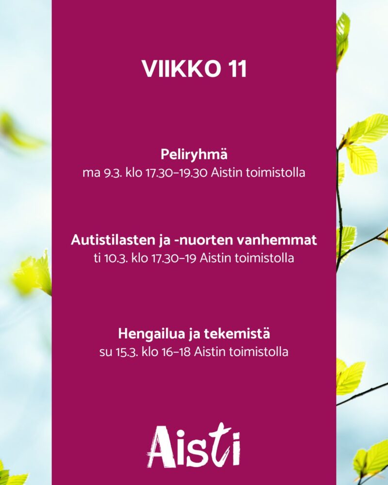 Autistilasten ja -nuorten vanhemmat ti 10.3. klo 17.30–19 Aistin toimistolla