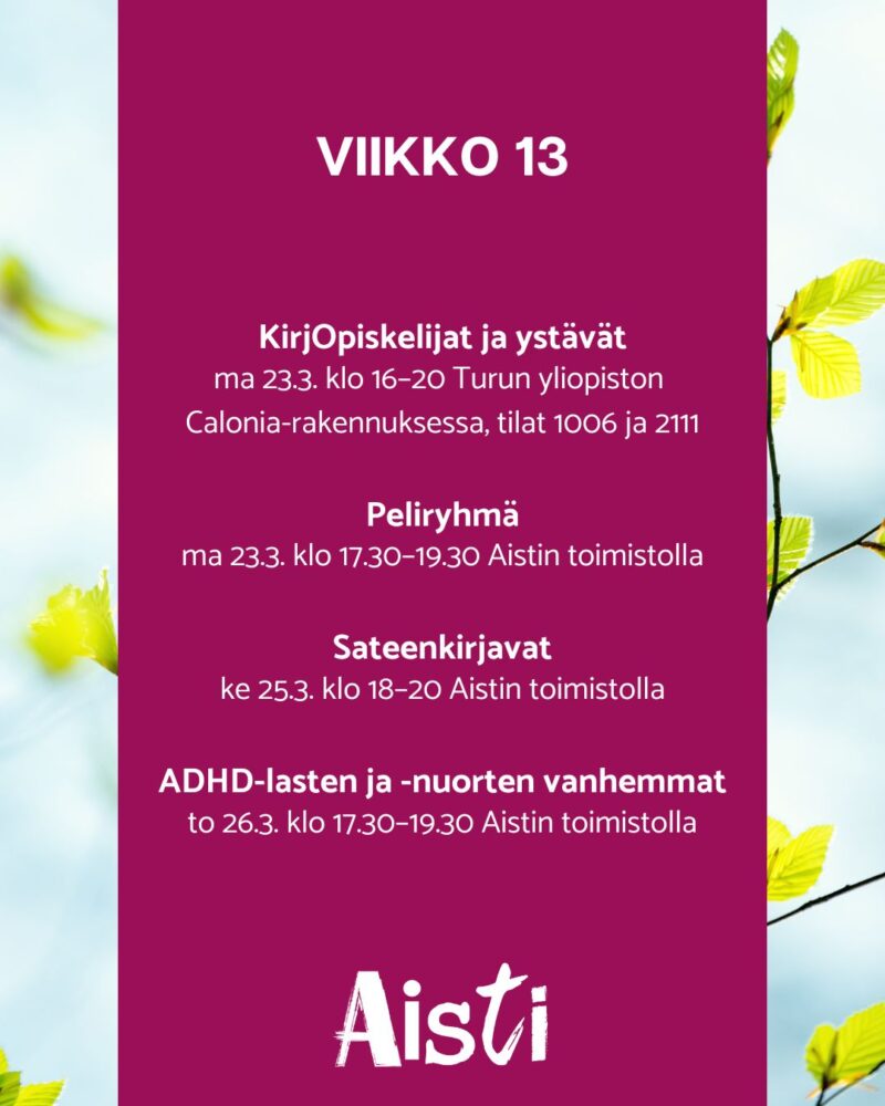 ADHD-lasten ja -nuorten vanhemmat to 26.3. klo 17.30–19.30 Aistin toimistolla